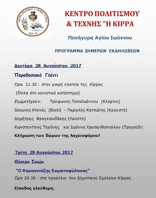 Πανήγυρη Αγίου Ιωάννου Κίρρας Πρόγραμμα 2ήμερων εκδηλώσεων