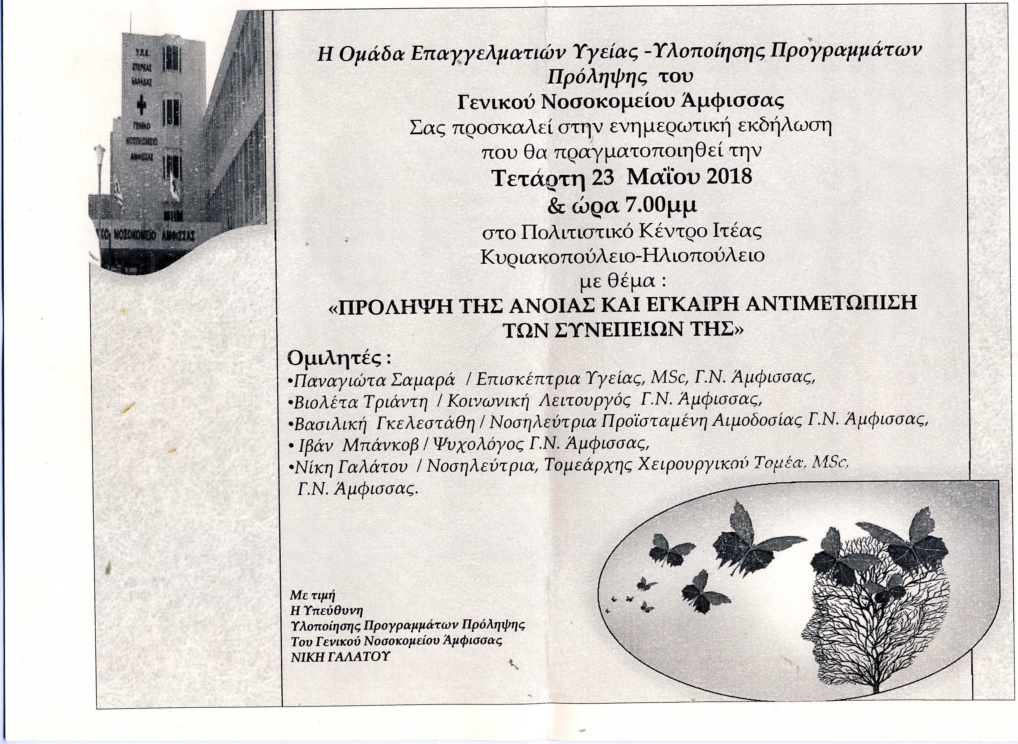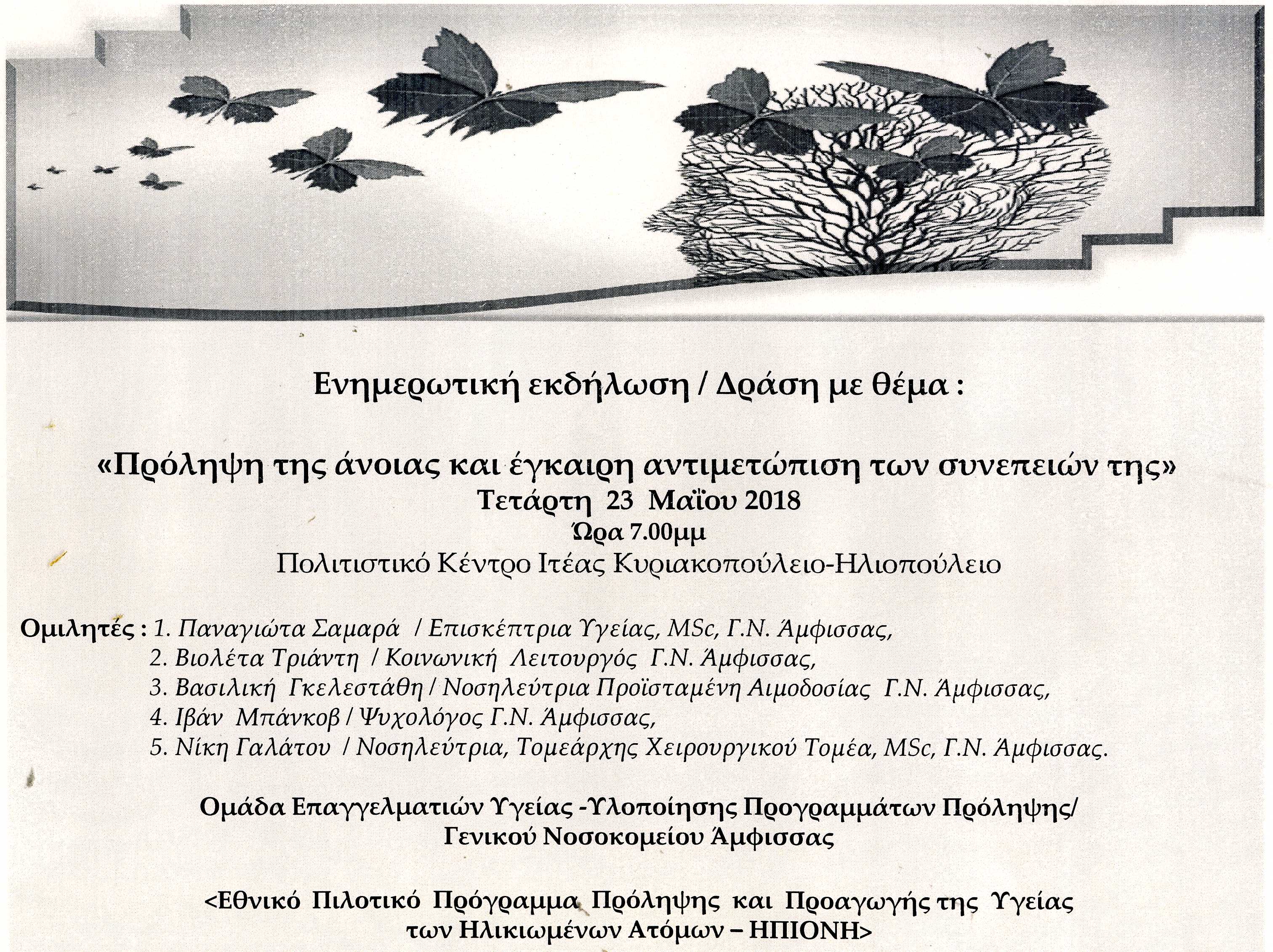 Πρόσκληση για ενημερωτική εκδήλωση με θέμα: ΠΡΟΛΗΨΗ ΤΗΣ ΑΝΟΙΑΣ ΚΑΙ ΕΓΚΑΙΡΗ ΑΝΤΙΜΕΤΩΠΙΣΗ ΤΩΝ ΣΥΝΕΠΕΙΩΝ ΤΗΣ