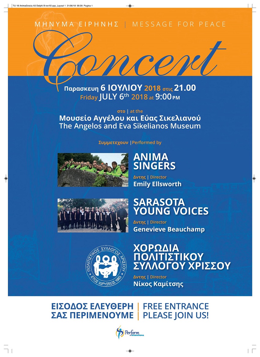 H χορωδία Anima Singers (Σικάγο/ΗΠΑ) με τη φημισμένη στις Ηνωμένες Πολιτείες διευθύντρια χορωδίας Emily Ellswort, και η χορωδία Sarasota Young Voices (Σαρασότα-Florida/ΗΠΑ), με Διευθύντρια την Genevieve Beauchamp, έρχονται στους Δελφούς για μία μοναδική Συναυλία με τον τίτλο “CHORALODYSSEY”