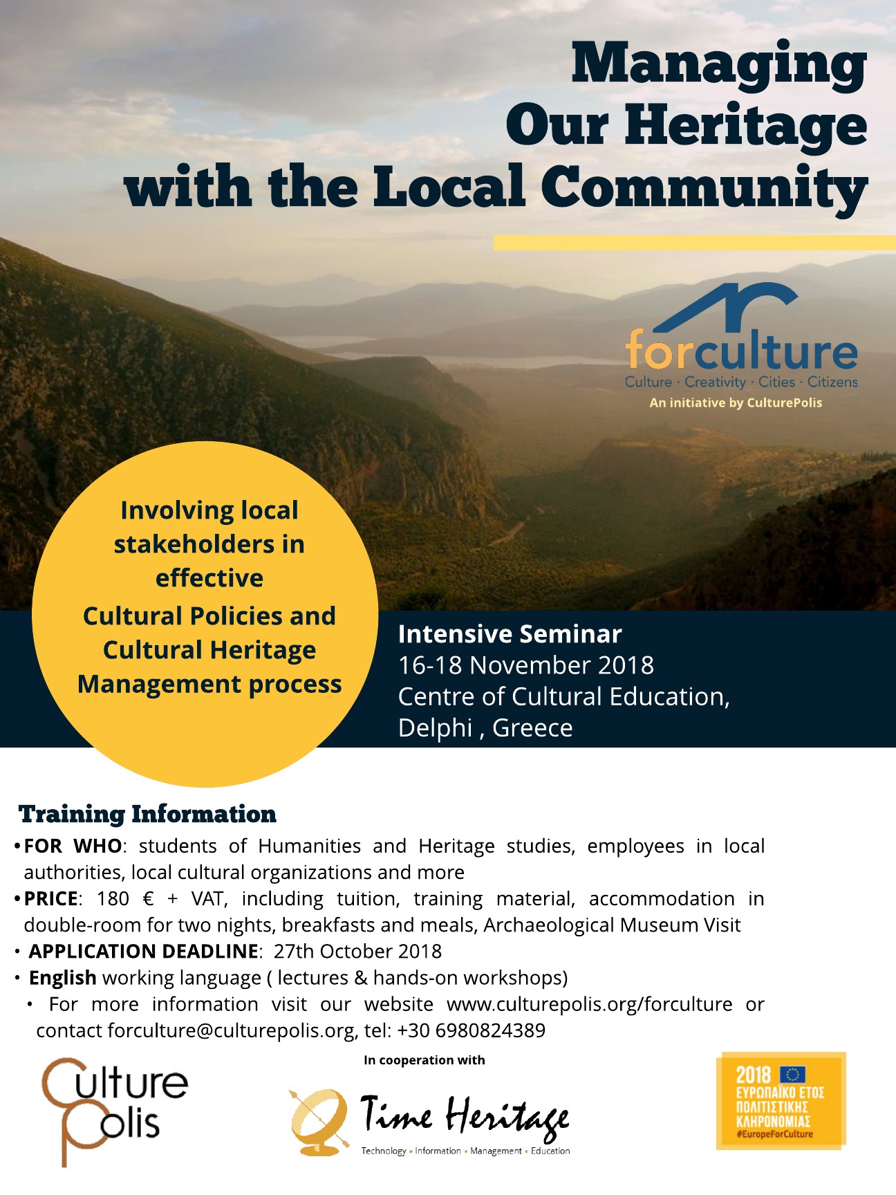 Εκπροσωπώντας την αστική μη κερδοσκοπική εταιρία CulturePolis, έχω τη χαρά να σας ανακοινώνω το πρώτο σεμινάριο της πρωτοβουλίας μας ForCulture με θέμα 'Managing our Heritage with the Local Community' το οποίο θα πραγματοποιηθεί 16-18 Νοεμβρίου στους Δελφούς.