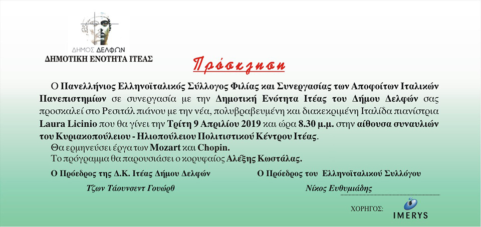 Πρόσκληση την Τρίτη 9 Απριλίου 2019 και ώρα 8:30 μμ στο Κυριακοπούλειο Ιτέας