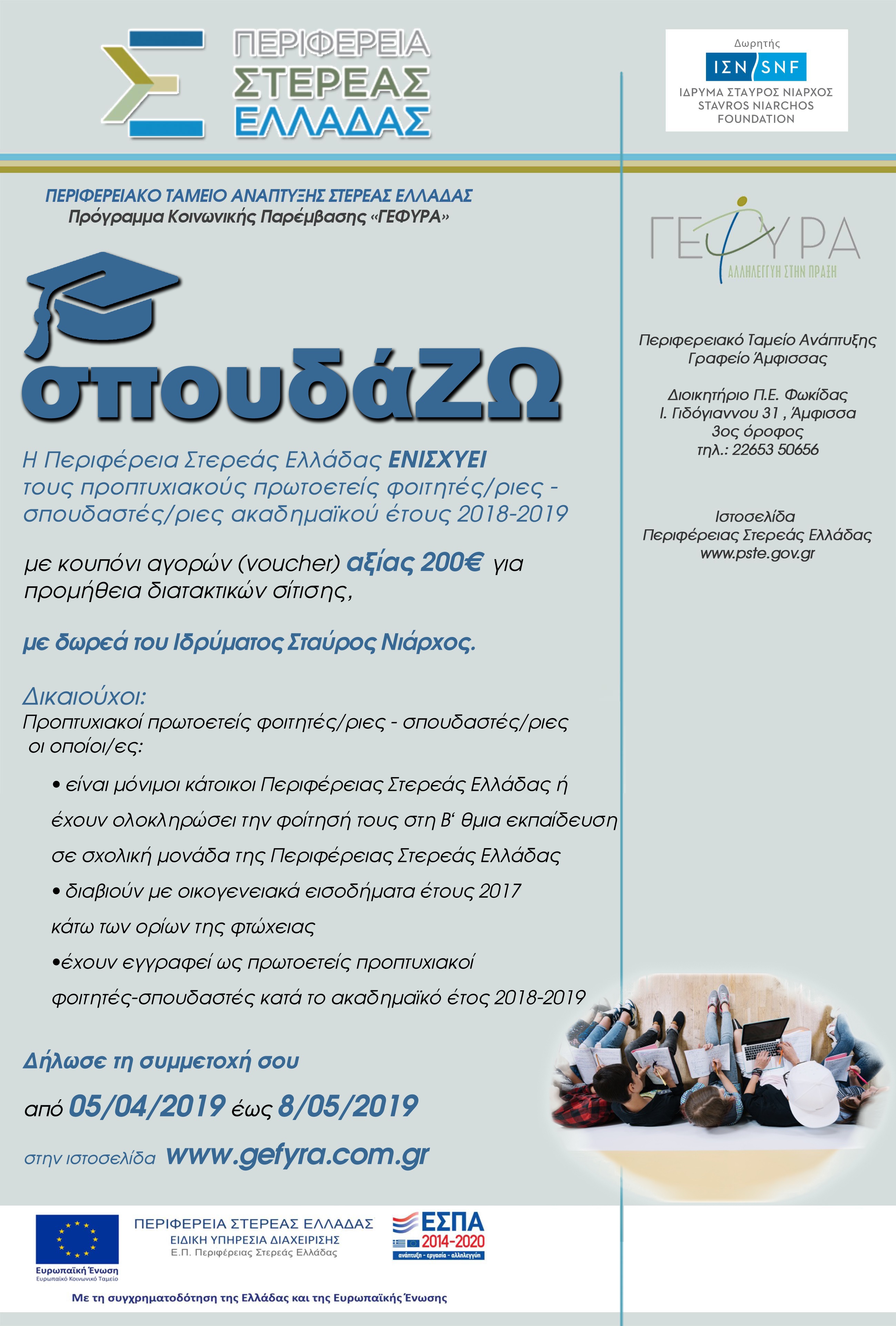 «Παροχή έκτακτης οικονομικής ενίσχυσης σε προπτυχιακούς πρωτοετείς φοιτητές- σπουδαστές του ακαδημαϊκού έτους 2018-2019, μέλη οικογενειών της Περιφέρειας Στερεάς Ελλάδας, που διαβιούν κάτω από τα όρια της φτώχειας, με κουπόνι αγορών (voucher) για την προμήθεια διατακτικών σίτισης», με δωρεά του Ιδρύματος Σταύρος Νιάρχος