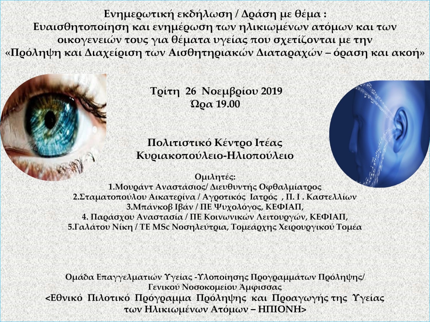Ενημερωτική εκδήλωση με θέμα: Ευαισθητοποίηση των ηλικιωμένων ατόμων και των οικογενειών τους με θέματα υγείας που σχετίζονται με την 'Πρόληψη και Διαχείριση των Αισθητηριακών Διαταραχών - Όραση και Ακοή