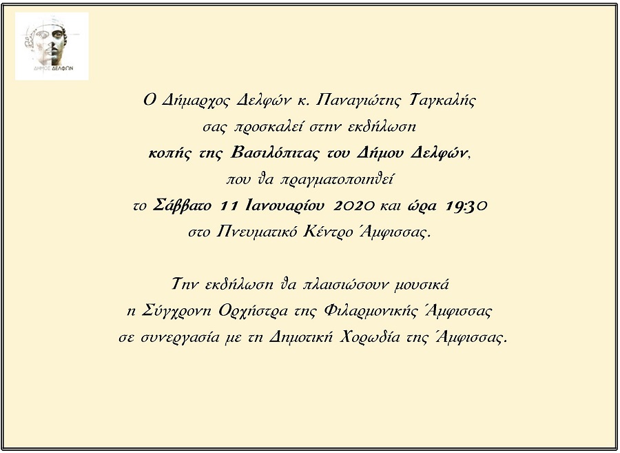 Πρόσκληση κοπής πίτας 2020 Δήμου Δελφών