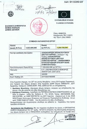 ΘΕΜΑ: ΥΠΕΓΡΑΦΗ ΤΟ ΣΥΜΦΩΝΗΤΙΚΟ ΤΟΥ ΕΡΓΟΥ «ΟΛΟΚΛΗΡΩΣΗ ΑΠΟΧΕΤΕΥΤΙΚΟΥ ΔΙΚΤΥΟΥ ΚΙΡΡΑΣ» ΥΨΟΥΣ 1.259.138,53 € , ΜΕΤΑΞΥ ΤΟΥ ΔΗΜΑΡΧΟΥ ΔΕΛΦΩΝ ΝΙΚΟΛΑΟΥ ΦΟΥΣΕΚΗ ΚΑΙ ΤΟΥ ΕΚΠΡΟΣΩΠΟΥ ΤΗΣ ΑΝΑΔΟΧΟΥ ΕΤΑΙΡΕΙΑΣ «ΠΕΡΙΒΑΛΛΟΝΤΙΚΗ ΕΝΕΡΓΕΙΑΚΗ Α.Ε.», ΤΗΝ ΠΑΡΑΣΚΕΥΗ 29.11.2013.