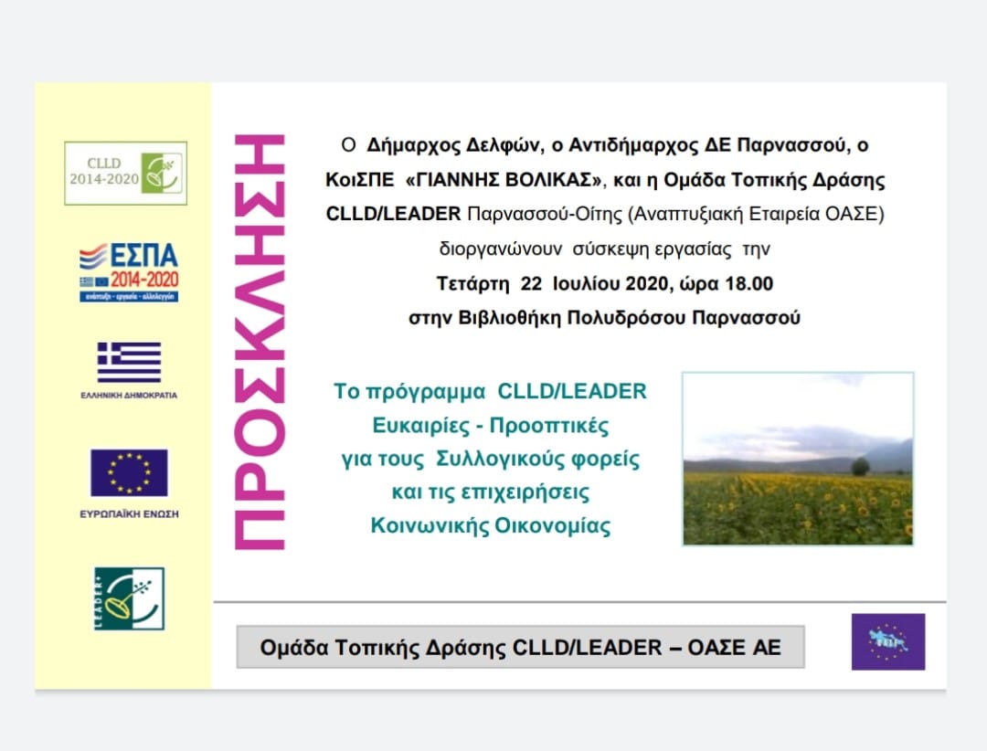 Πρόσκληση σε σύσκεψη εργασίας με θέμα "Το πρόγραμμα CLLD/LEADER Ευκαιρίες- Προοπτικές για τους Συλλογικούς Φορείς και τις επιχειρήσεις Κοινωνικής Οικονομίας"