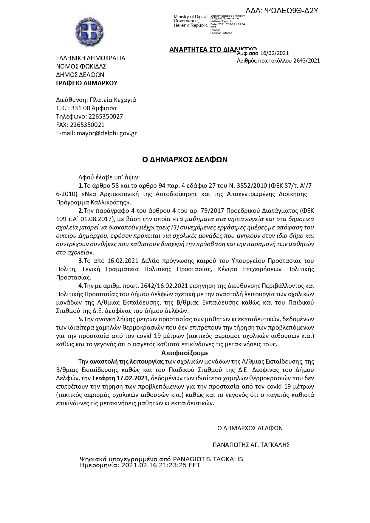 Αναστολή της λειτουργίας των σχολικών μονάδων της Α/θμιας Εκπαίδευσης, της Β/θμιας Εκπαίδευσης καθώς και του Παιδικού Σταθμού της Δ.Ε. Δεσφίνας του Δήμου Δελφών, την Τετάρτη 17.02.2021.