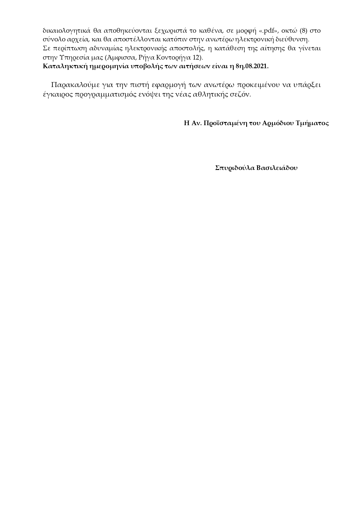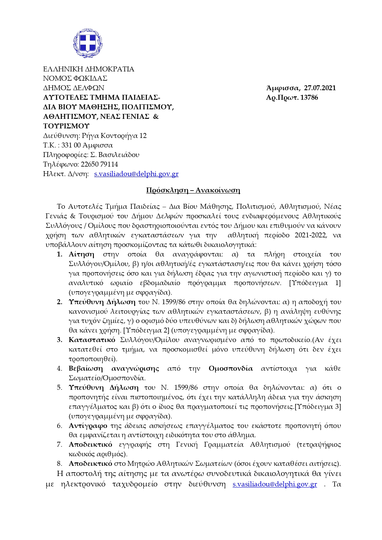 Πρόσκληση υποβολής αιτήσεων για χρήση των αθλητικών εγκαταστάσεων για την αθλητική περίοδο 2021-2022.