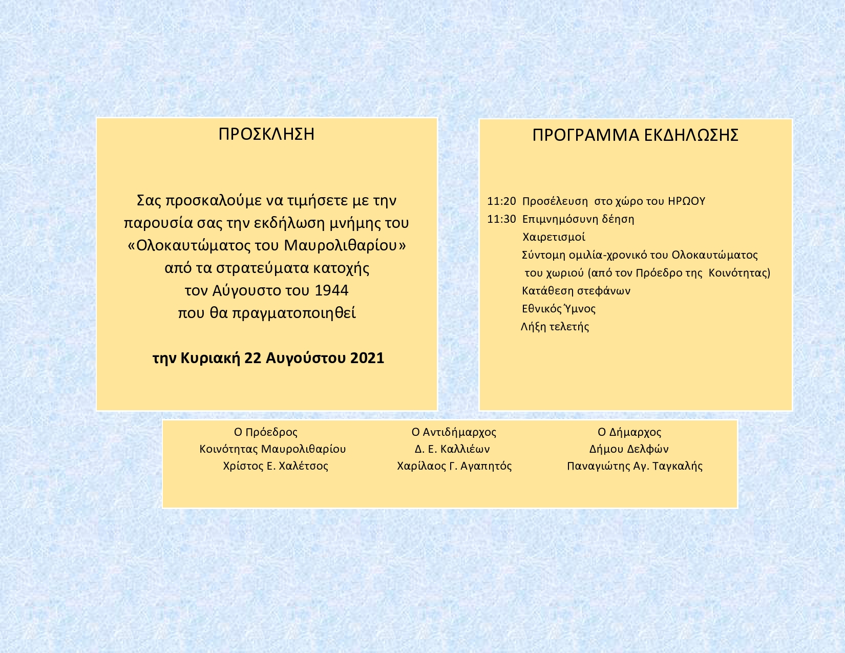 Εκδήλωση μνήμης "Ολοκαύτωμα του Μαυρολιθαρίου Αύγουστος 1944"- Κυριακή 22 Αυγούστου 2021