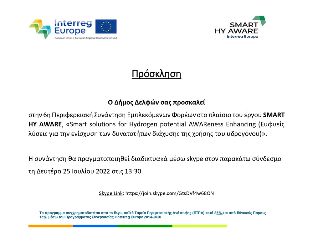 Πρόσκληση στην 6η Περιφερειακή Συνάντηση Εμπλεκόμενων Φορέων στο πλαίσιο του έργου SMART HY AWARE